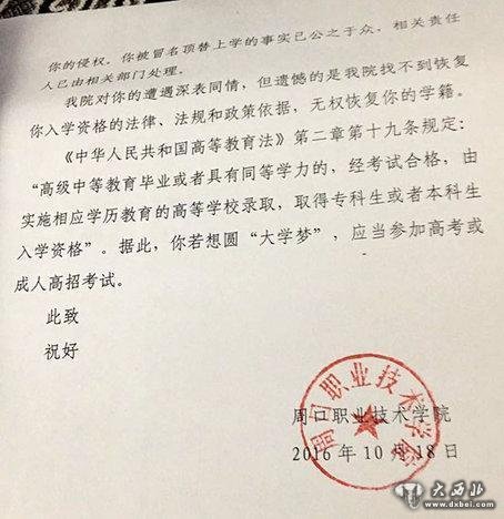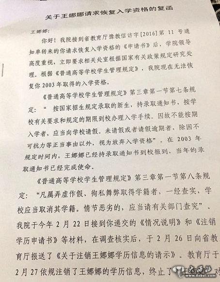 9月14日,王娜娜向周口职业技术学院邮寄《学籍恢复申请》。10月18日,周口市职业技术学院出具回函称:“在2003年规定时间内,王娜娜已经持录取通知书到校报到,当年录取通知书已经完成使命……你被冒名顶替上学的事实已公之于众,相关责任人已有相关部门处理……找不到恢复你入学资格的法律、法规和政策依据,无权恢复你的学籍。”