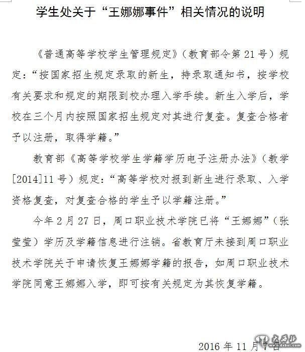 10月18日,周口市职业技术学院向王娜娜出具复函