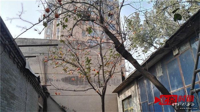 贾发义破败的小院里,两棵柿子结了果,他的小院紧挨着回迁房 图/北京时间 刘思维