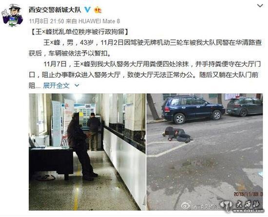 有媒体11月9日从陕西西安市公安局交通警察支队新城大队获悉,西安男子王某峰因为两次到交通警察支队新城大队的警务大厅涂抹粪便,致使大厅无法正常办公,已被警方行政拘留。新城大队工作人员告诉澎湃新闻,王某峰此前驾驶无牌机动三轮车被大队民警查获,车辆被予以暂扣。