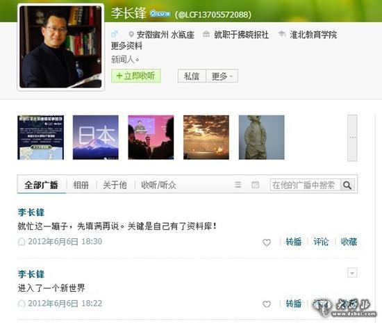 2012年6月3日,李长锋开通了实名认证腾讯微博,认证信息为“地点:安徽宿州,单位:就职于拂晓报社,教育背景:淮北教育学院”,并发布微博称是“进入了一个新世界”。自此至2015年初,他频繁使用微博,内容主要是分享些他的书画作品以及随笔。