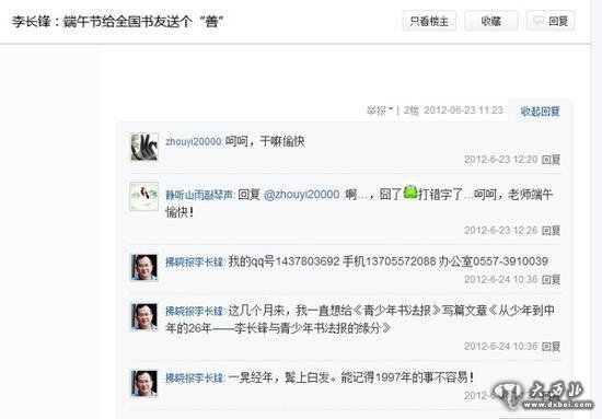 其中,2012年6月23日,“拂晓报李长锋”在“书法吧”张贴了一张署名李长锋的“善”字书法作品,并附上了李长锋的照片。有一个女网友对其进行了回复,该账号就直接给这名网友回复了自己的QQ号码、手机和办公室电话号码。