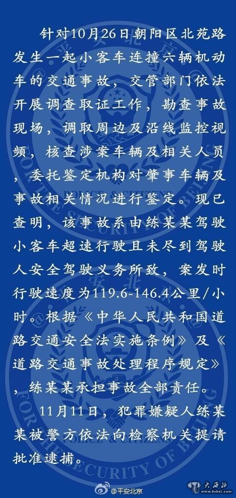 针对10月26日朝阳区北苑路发生一起小客车连撞六辆机动车的交通事故,交管部门依法开展调查取证工作,勘查事故现场,调取周边及沿线监控视频,核查涉案车辆及相关人员,委托鉴定机构对肇事车辆及事故相关情况进行鉴定。现己查明,该事故系由练某某驾驶小客车超速行驶且未尽到驾驶人安全驾驶义务所致,案发时行驶速度为119.6-146.4公里/小时。根据《中华人民共和国道路交通安全法实施条例》及《道路交通事故处理程序规定》,练某某承担事故全部责任。