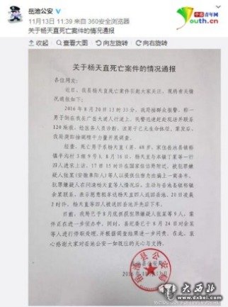 11月13日岳池警方发布了《关于杨天直死亡案件的情况通报》。