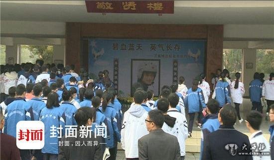 师生们默哀三分钟,最后,同学们来到了敬贤楼,向余旭的遗像献花。敬贤楼底楼,余旭的照片被放大到一米多高。照片中,她一身戎装,浅笑盈盈地望着大家,仿佛起飞前与大家作别。