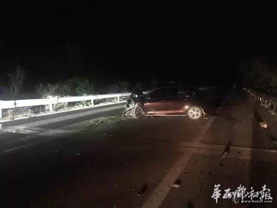 据目击者称,第一次事故,是轿车在高速路上撞上了一只突然出现的羊,轿车前部严重变形,车上两人受伤。
