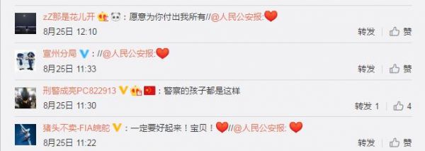 记者浏览微博发现,这张照片感动了众多网友,有的为侯飞深沉的父爱而感动,有的为侯飞的敬业精神而感动,有的向辛苦的警嫂杨燕表达敬意。