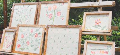 石桥古法造纸制品有白皮纸和彩色纸两种类型,其中彩色纸可分六大系列,在小院最受追捧的当数花草琥珀纸。先将纸浆铺入一个方形木框内,然后取新鲜花草随意搭配,在纸浆上组合成自己喜欢的图案,再在上面覆盖一层纸浆,一幅精美的花草画卷便跃然而出。最后把作品框搬到后院进行晾晒,3个小时后,花草琥珀纸就大功告成了。斗转星移,花草的自然形态和本真色彩将与纸张融为一体,原本短暂的绚烂得以长久保存。