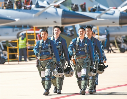 蔡宗君(前左一)和战友们信心满满地走向战机。\