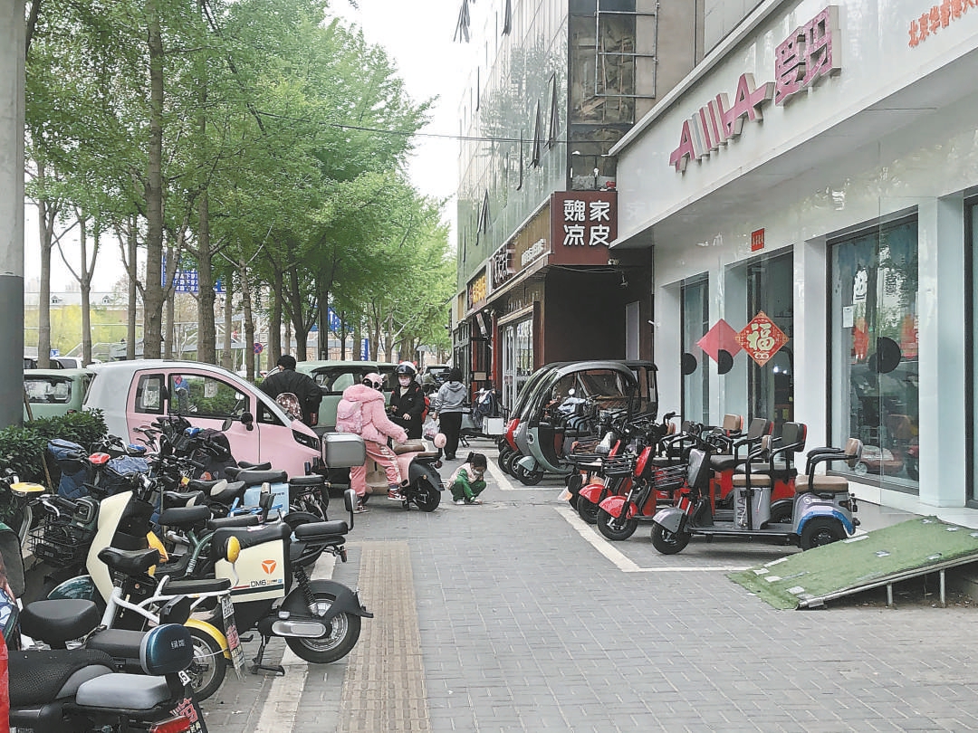 在多位家长的指引下,记者来到了附近的新华南路,路西侧有多家电动车行。待出售的电动三轮车占满了店门前的便道,令人眼花缭乱,不少准备购车的顾客正在听商家“解读”购车和驾驶方面的法律法规。