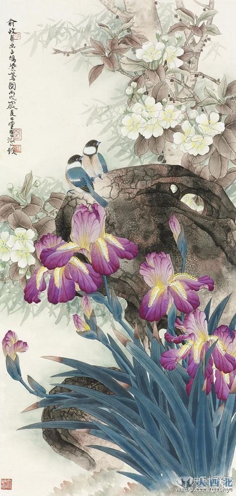 俞致贞 工笔花鸟《子鴂紫鸢图》