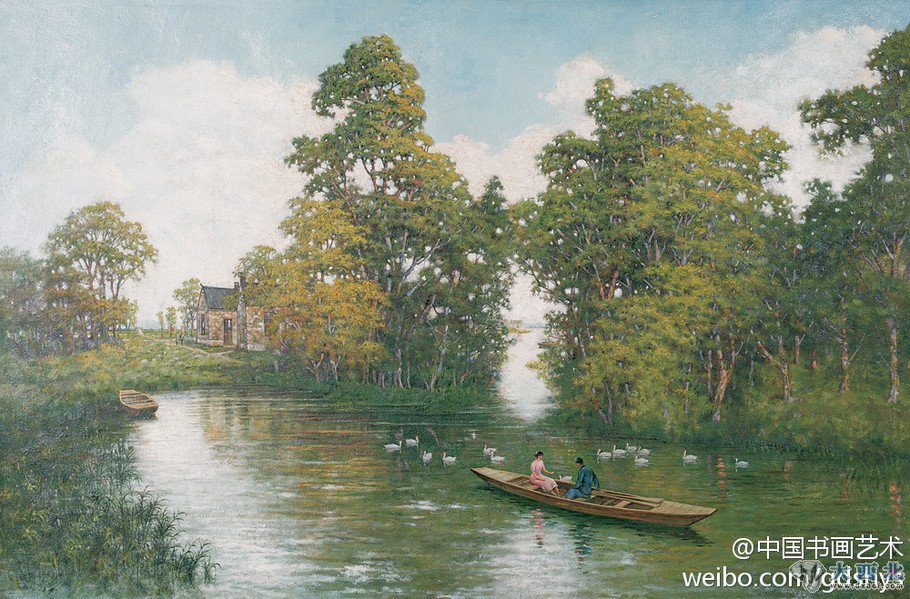 【赏析】颜文梁作品多见小品,以细腻雅致的风格受到众人所喜爱,此幅有其秀丽精致的风格,细微至湖面鹅群、旷阔至蓝天白云,其色调层次变化精心绘制,从中亦可见艺术家对此画极具用心之处!