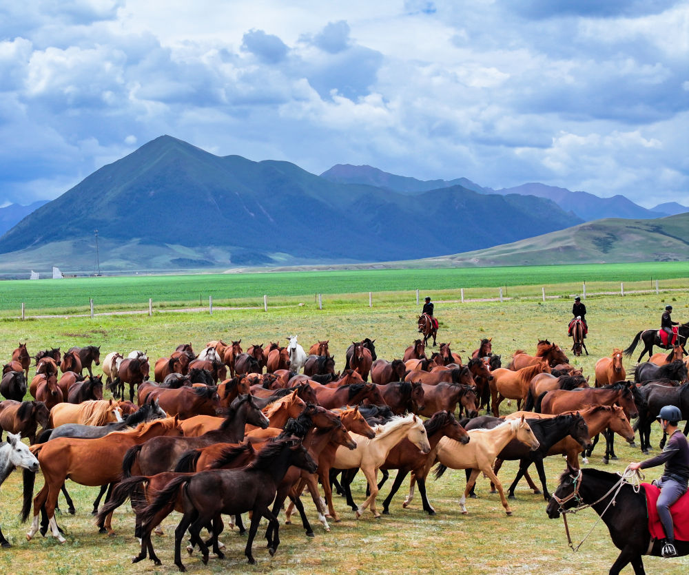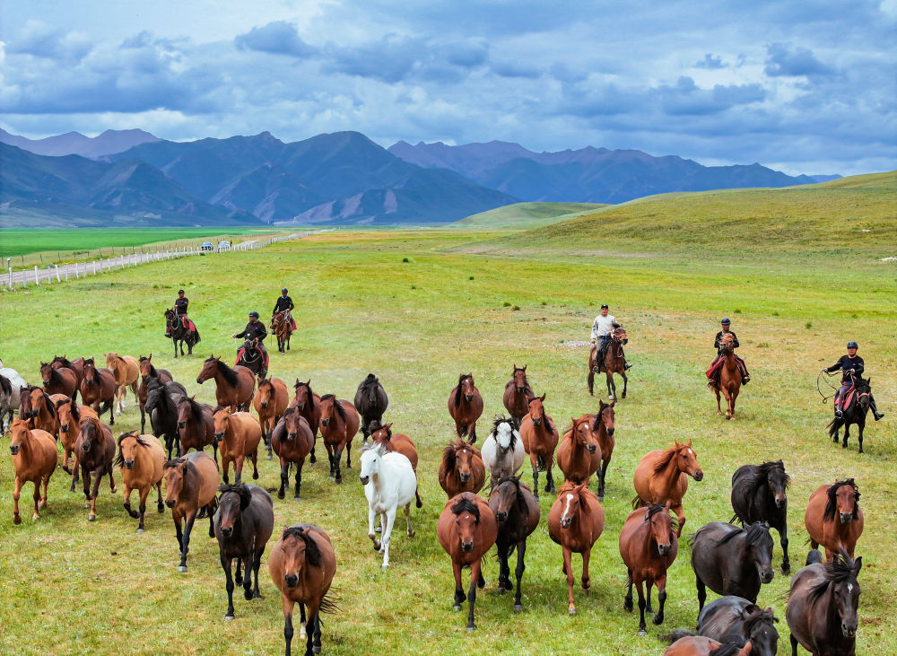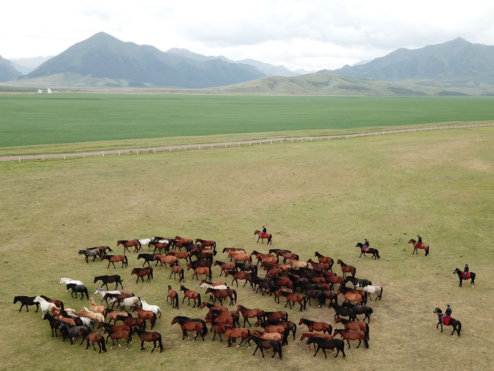 夏日,在位于河西走廊中部、祁连山冷龙岭北麓大马营草原的山丹马场,成群的骏马欢腾觅食,十分壮观。自汉代起,山丹马场就开始养马。如今,“山丹马”保种和速力型赛马培育是山丹马场养殖业发展的重要方向。