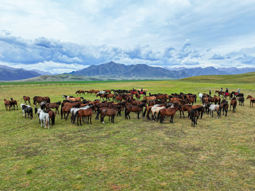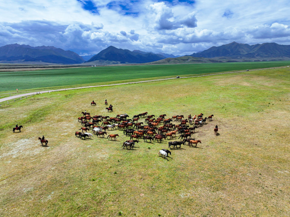 这是8月6日在山丹马场一场有限责任公司拍摄的马群(无人机照片)。新华社记者马宁摄