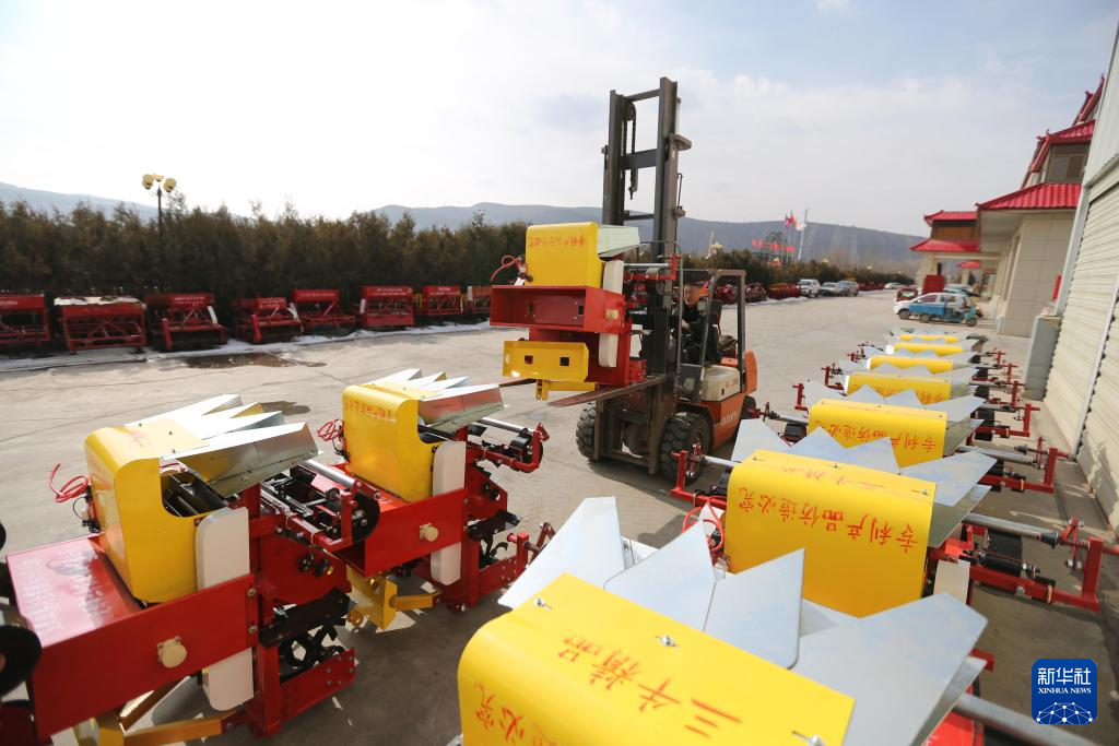 2月21日,甘肃省定西市一家农机制造企业工人驾驶叉车转运准备外销的农机。新华社发(王克贤摄)