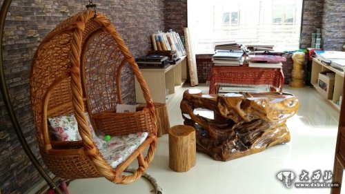 在中堂两端的更远处,还分别设置了两个大型的椭圆形吊椅,椅子以藤条工艺由实木编制而成。在灯光的照耀下,每一个弧度都闪烁着柔和的光感,这或许是一种中堂的摆设方式,或许是木雕家具体验馆展示的另一种产品。因为这种摆放连销售人员也难以一时肯定那种说法更妥帖。