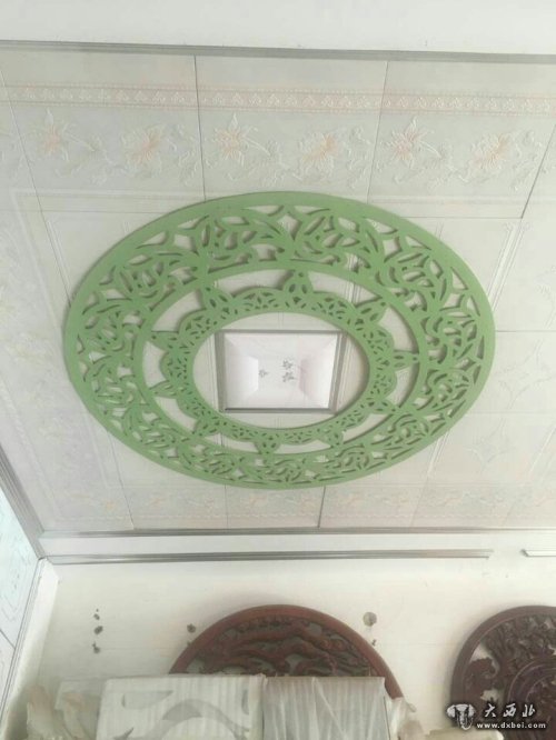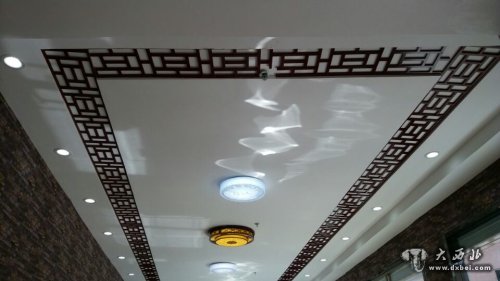 跟随销售人员的手势,我们抬望眼发现,在体验馆吊顶的四边是规则整齐的木雕边花,中间排列着三盏中式造型的灯,灯光开启,把体验馆映衬得更具人文气息。