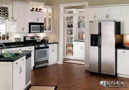 一定要事先设计好冰箱的位置,以使“工作三角”设计合理。注意不要让冰箱紧挨着水槽,以免溅上水、漏电等。