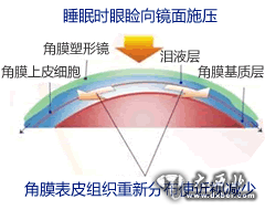 角膜塑形镜是采用了一种特殊逆几何形态设计的镜片,其内表面由多个弧段组成。镜片与泪液层分布不均,由此产生的流体力学效应改变角膜几何形态,在睡觉时戴在角膜前部,逐步使角膜弯曲度变平、眼轴缩短,从而有效地阻止了近视的发展。