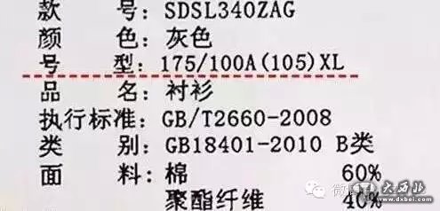 号型中没有标明身高和胸围的衣服是不合格的。合格衣服的号型标注:“175/100A”,175表示身高、100表示胸围、A表示体型。A表示“正常”、B表示“偏胖”、C表示“胖”、Y表示“偏瘦”。
