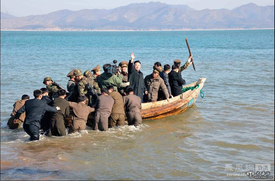3月12日公布图片,朝鲜最高领导人金正恩11日视察了朝鲜西南前线的月乃岛防御部队,后乘木船离开。