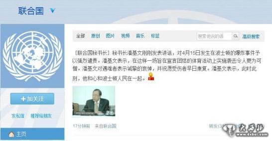 中新网4月16日电据联合国官方微博消息,联合国秘书长潘基文在北京时间16日发表讲话,对发生在波士顿的爆炸事件予以强烈谴责。