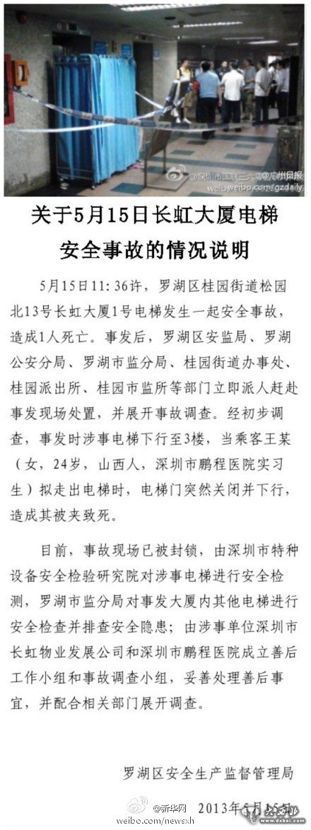另据广州日报微博报道:今天中午,深圳长虹大厦, 一个24岁女护士,乘坐电梯从16楼到达3楼,电梯门打开,女孩拟走出电梯时,不料电梯门突然关闭并下行,夹断其头部,并迅速坠下负一楼。女护士当场死亡,血洒电梯内的十多名乘客。据@深圳微博发布厅也证实这一消息。电梯有风险,搭乘请小心!