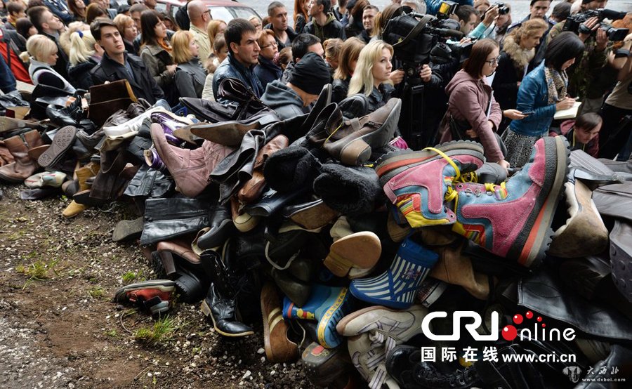 大西北网10月9日讯,据人民网报道,当地时间2013年10月8日,乌克兰基辅,乌克兰内阁部长大楼前堆放着数百双旧鞋,这些旧鞋的主人都因患艾滋而过世。当天部分乌克兰人示威抗议关闭乌克兰HIV治疗中心,政府答应在别处再建艾滋治疗医院但至今没有下文,许多患者不得不去别处接受治疗。