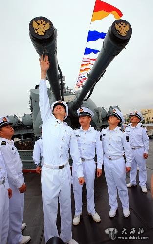 5月19日,俄罗斯海军“瓦良格”号导弹巡洋舰官兵前往中国海军导弹驱逐舰郑州舰参观。