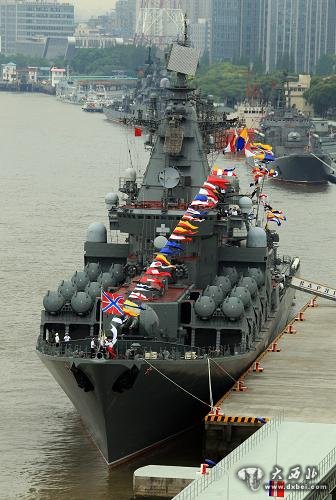 俄罗斯也有大批军舰陆续抵达上海,包括“瓦良格”号导弹巡洋舰、“潘捷列耶夫海军上将”号反潜舰、“快速”号导弹驱逐舰、“涅韦利斯基海军上将”号大型登陆舰和一艘拖船及舰载直升机等。
