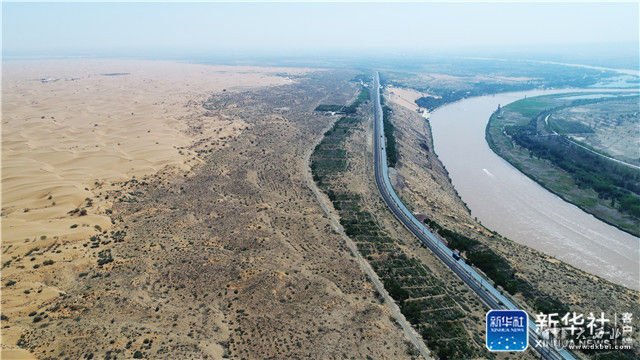 ↑包兰铁路在防护带的保护下沿着黄河穿过腾格里沙漠(5月30日无人机拍摄)。新华社记者卢鹰摄