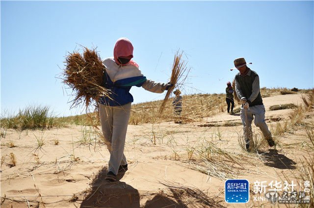 女人们将麦草均匀地铺在沙子上,男人们拎起铁锹把麦草扎进去。“从麦草的中间扎下去,入沙10公分,露出30公分左右。草扎直立,横竖成行,间距1米。”郑自华向记者描述着技术要领,手中铁锹移动的频率丝毫没有被打乱。