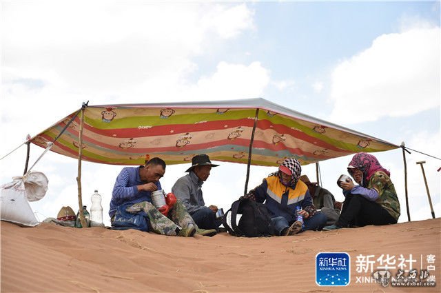 ↑扎草方格的工人们在腾格里沙漠里吃午饭(6月11日摄)。新华社记者卢鹰摄