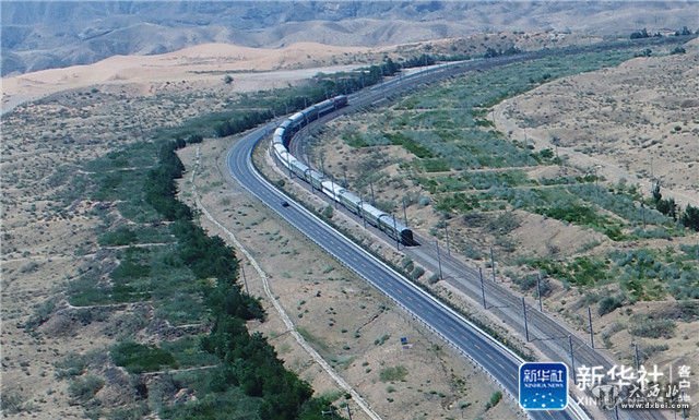 ↑一列火车行驶在穿越腾格里沙漠的包兰铁路上(6月12日无人机拍摄)。新华社记者卢鹰摄