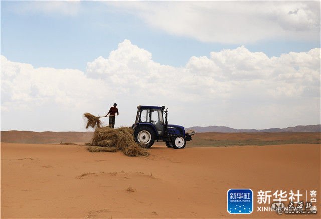 ↑一位工人在腾格里沙漠从铲车上卸下麦草(6月11日摄)。新华社记者曹江涛摄