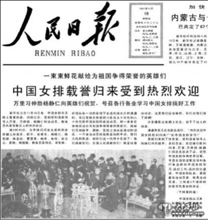 中国女排首次夺得世界冠军后,当时《人民日报》的报道。
