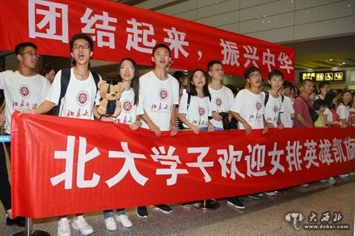 2016年,北大学子在机场迎接女排队员回国,再次竖起了“团结起来,振兴中华”的口号。