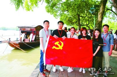 浙江嘉兴南湖,党员干部手擎党旗与红船合影留念。光明日报记者郭俊锋摄/光明图片