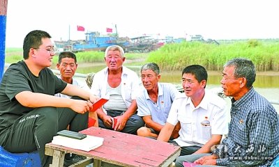 7月11日,山东滨州沾化区冯家镇渔船停靠点,冯家镇海上党支部“送学小分队”成员崔浩(左一)在为渔民党员讲解党章。王建彬摄/光明图片