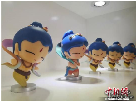 敦煌的设计师们将敦煌元素与现代生活相结合,研发出产品涉及生活家居、办公文具、精美饰品等,备受中外游客青睐。图为萌趣可爱的漫画版飞天娃娃。史静静摄