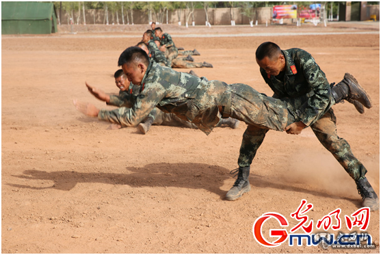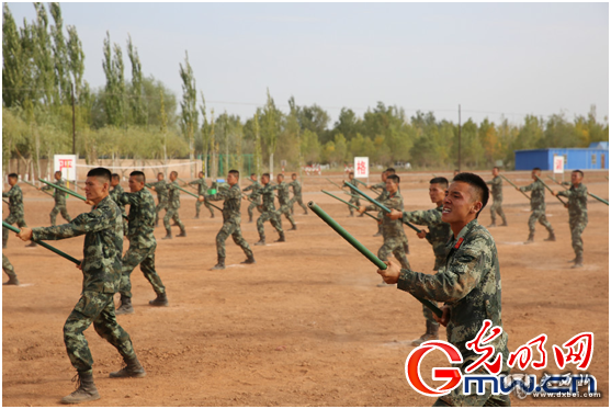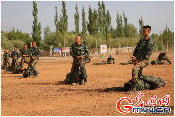 在9月22日开展的一场以反袭击为背景的实战演练中,执勤二中队的戍边武警将训练场当战场,凝神聚力操练棍术,擒拿格斗士气高昂,杀声震天。(记者赵清建摄影报道)