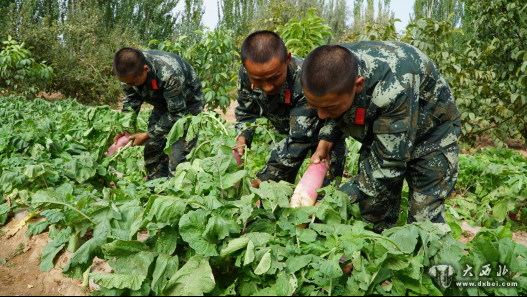 战士在菜地收萝卜。张芯蕊 摄