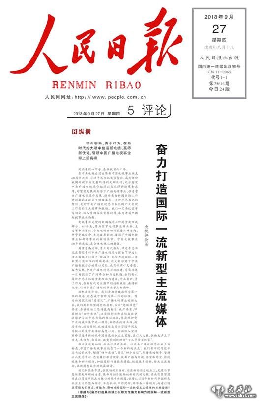 央视网消息:9月27日出版的人民日报在显著位置刊发央视评论员文章《奋力打造国际一流新型主流媒体》。全文如下: