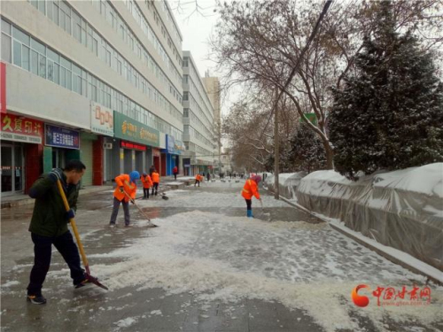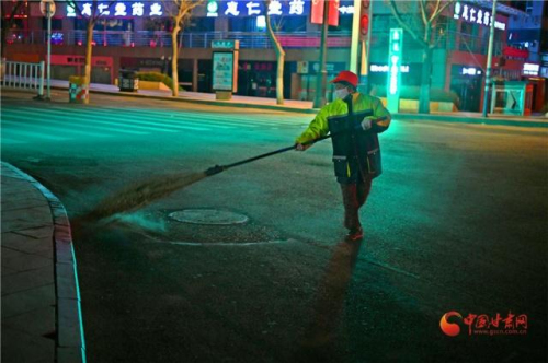 2017年2月20日夜榆中县城降雪成冰,县城市管理执法局分管环卫工作的副局长孙延宁早上5点就到了马路上,拿起铁锹和环卫工人一起将人行道上的冰雪铲除,一直工作到中午11点多。