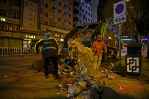 夜幕下,环卫工人将清扫收集到集中点的垃圾装上压缩式垃圾车,当天空透过晨曦的时候,集中点的垃圾已经被清理一空。