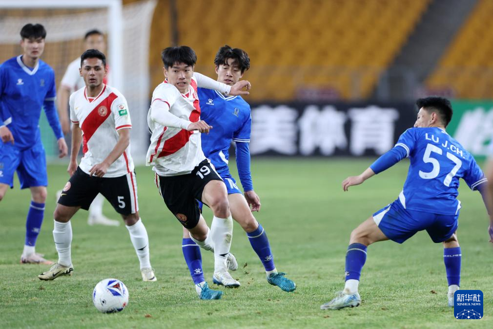 3月23日,兰州陇原竞技队球员陈子桐(右三)在比赛中带球突破。新华社记者 陈斌 摄