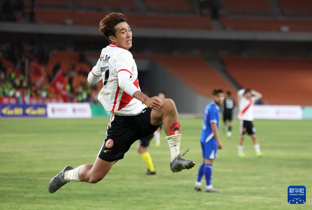 3月23日,兰州陇原竞技队球员杨胜茗在破门得分后庆祝。新华社记者 陈斌 摄