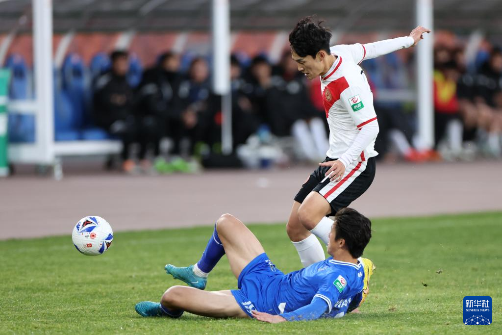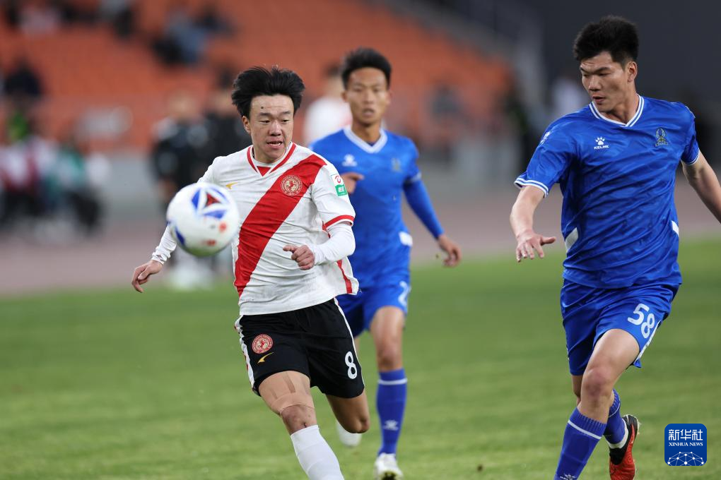 3月23日,兰州陇原竞技队球员张崇光(左)在比赛中带球突破。新华社记者 陈斌 摄