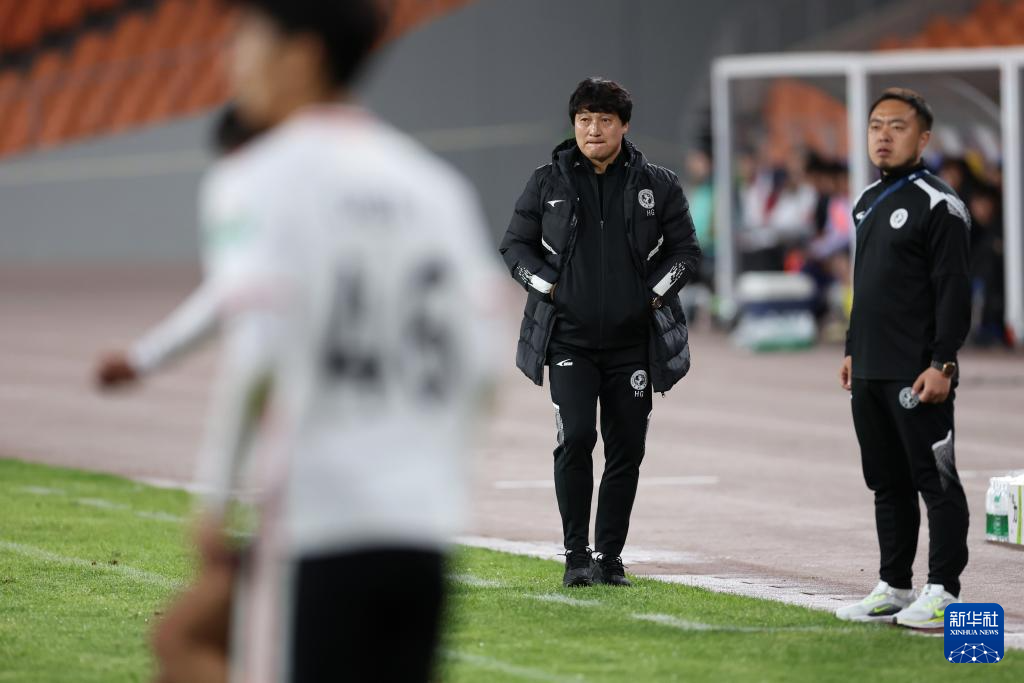 3月23日,兰州陇原竞技队主教练辛弘基(右二)在场边指挥。新华社记者 陈斌 摄