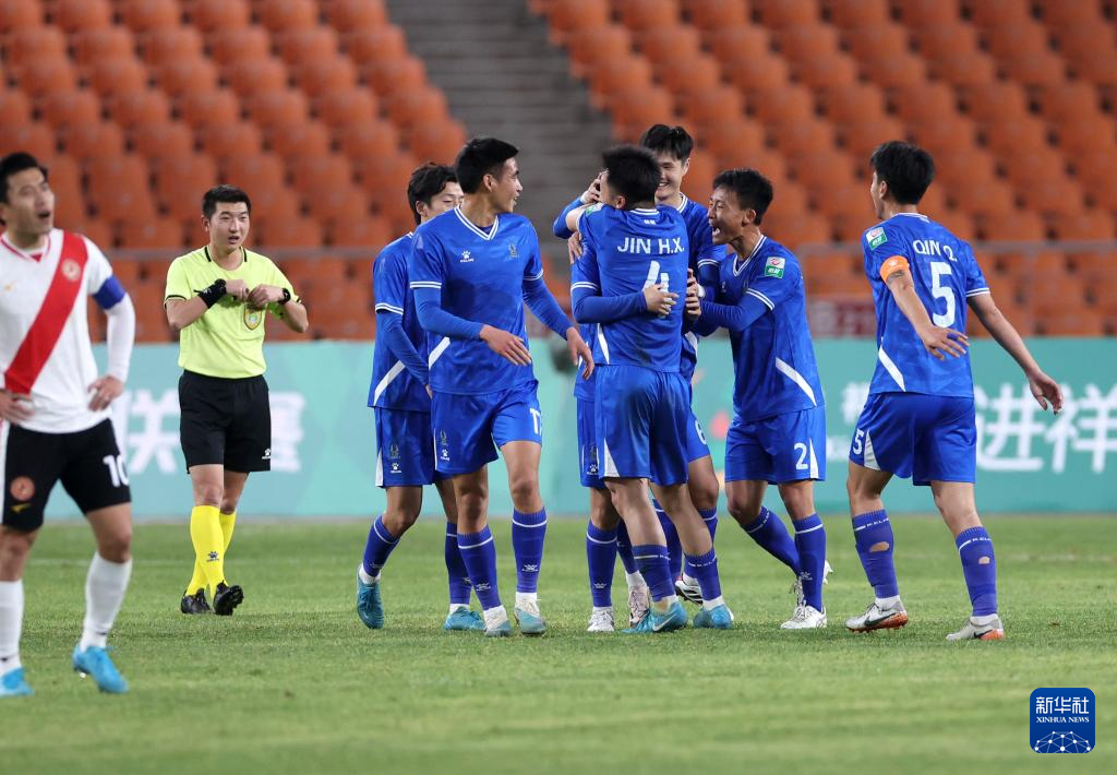 3月23日,兰州陇原竞技队球员杨胜茗(右二)在破门得分后庆祝。新华社记者 陈斌 摄